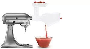 The fruit and vegetable strainer parts attach to the KitchenAid® Food Grinder Attachment (sold separately) to help you create incredible homemade applesauce, jelly or baby food in minutes. Once ingredients are through the grinder, the strainer cone removes any peels, leaving you with finely pureed fruits or vegetables.